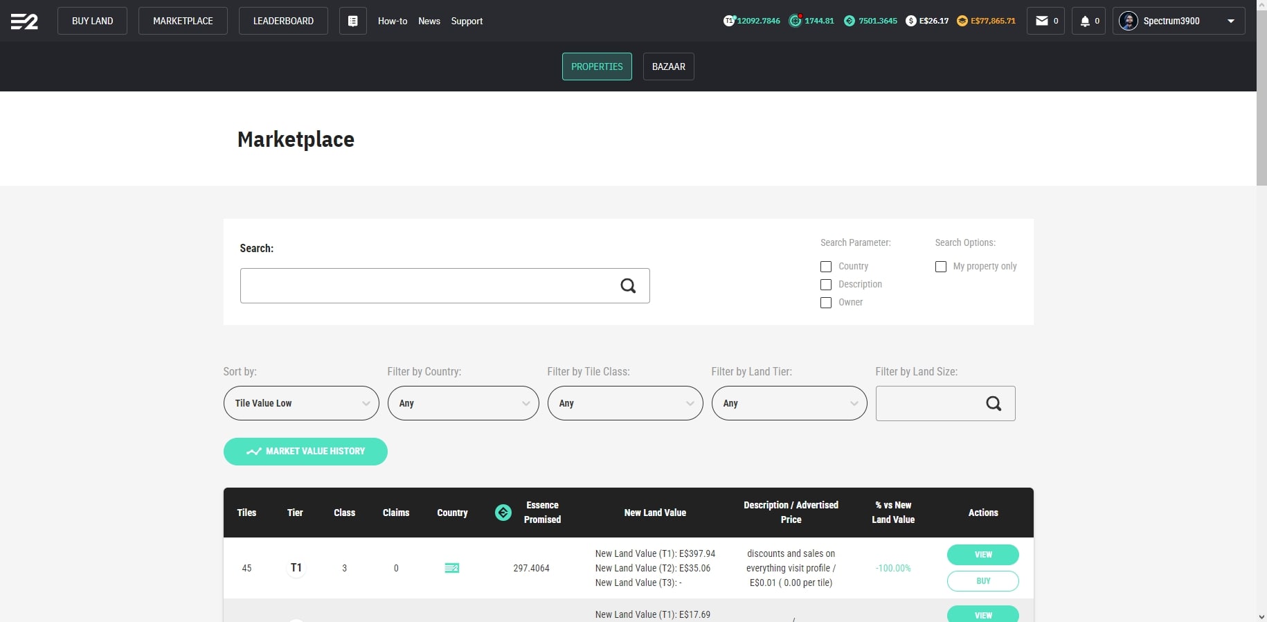 Tiles: You can buy new tiles (19.08m x 19.08m) from Earth2 and tiles from the marketplace from other players. There are Tier 1 (T1) tiles with better Jewels, EPL ready (custom URL ie: https://e2.me/... for properties), EDC (promised essence) and higher Eth-er/resources generation. Look for Class 1, 2, 3 to get rare location. Tier 2 (T2) land as well slightly cheaper price per tile and great for raiding location. And finally Tier 3 (T3) tiles starting at E$0.10 when a region has been voted by the players for purchase. Each Tier land have benefits which should correspond to your goals in Earth2.