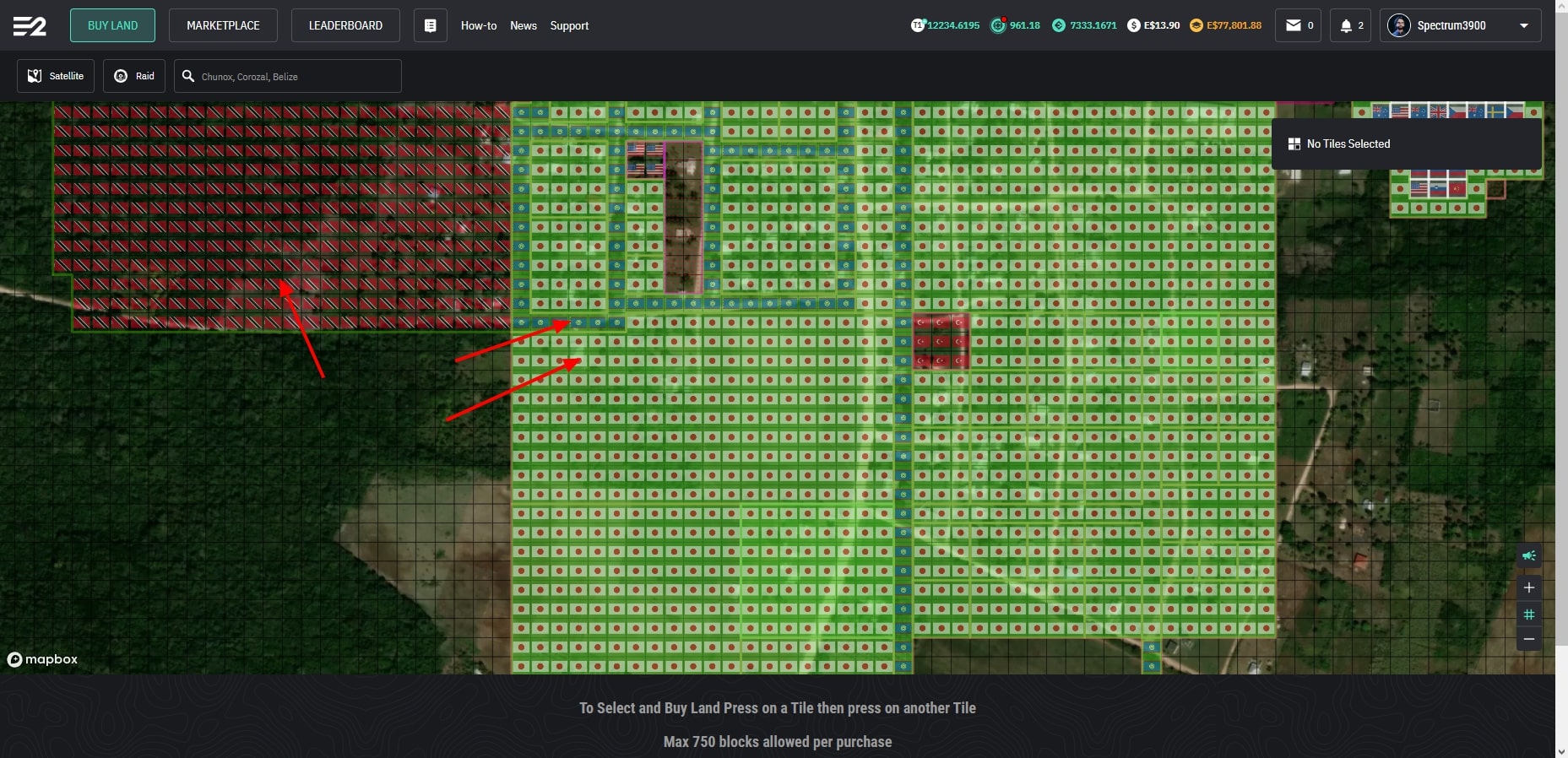 Here we can see land we own highlighted in green versus land we do not own and also empty tiles. You can change each property's flag