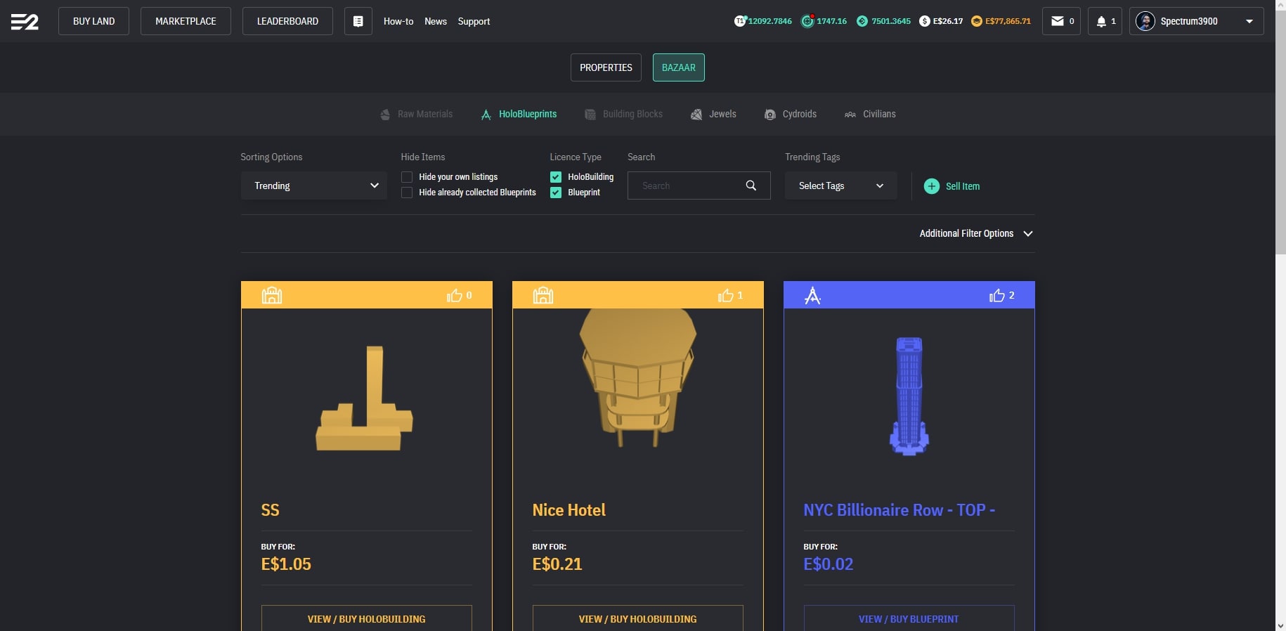Holobuildings: HB can be created for free if you have the patience of using the editor which is a voxel type of making shapes. It is quite hard but good designs can be sold to other players. HB is only seen on Earth2 website. HB is providing storage to properties. You can sell blueprints which can be used indefinitely and holobuildings which can be placed once per land.