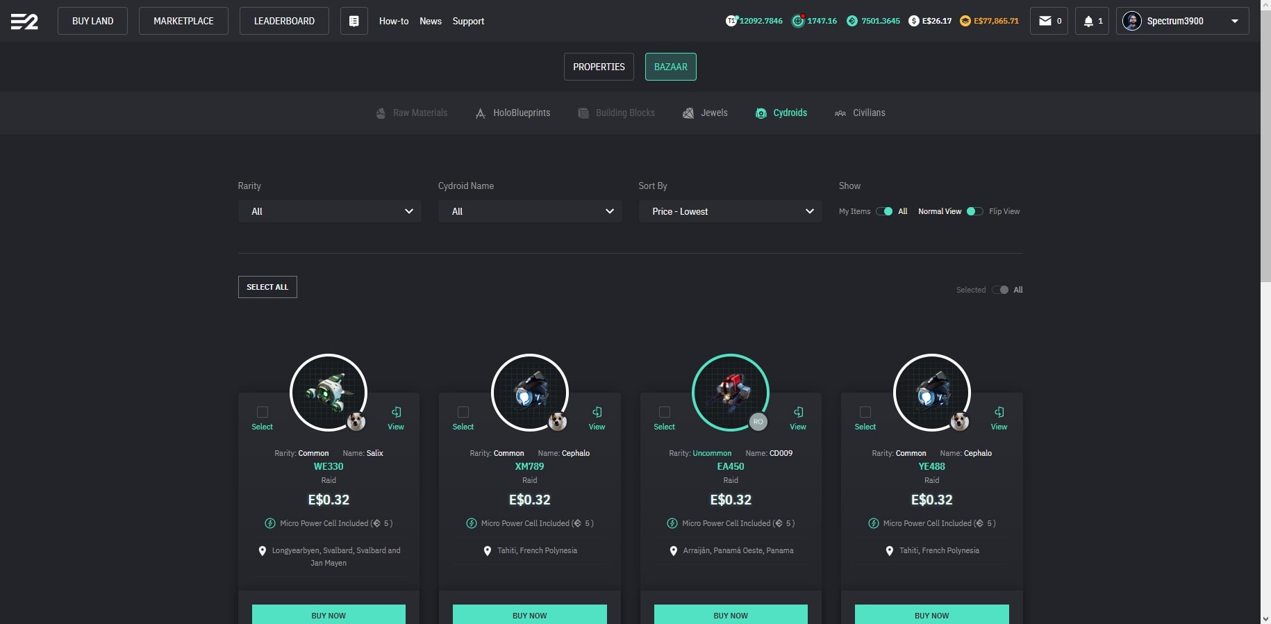 CyDroids: CyDroids can be built on a property of 4 tiles minimum. Those CyDroids can be purchased in the Bazaar from players. CyDroids can be used for raiding player's property near you to capture ETh-er not being pick up by other players. It is important to log in daily so that you don't get raided. CyDroids can also detect and gather resources.