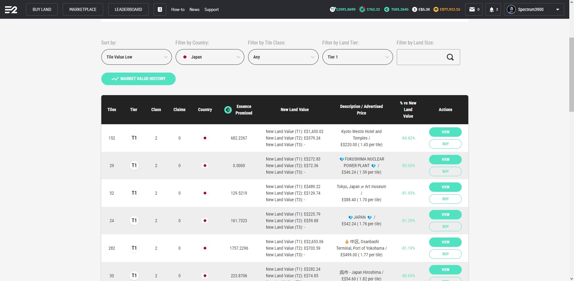 Tiles: You can buy new tiles (19.08m x 19.08m) from Earth2 and tiles from the marketplace from other players. There are Tier 1 (T1) tiles with better Jewels, EPL ready (custom URL ie: https://e2.me/... for properties), EDC (promised essence) and higher Eth-er/resources generation. Look for Class 1, 2, 3 to get rare location. Tier 2 (T2) land as well slightly cheaper price per tile and great for raiding location. And finally Tier 3 (T3) tiles starting at E$0.10 when a region has been voted by the players for purchase. Each Tier land have benefits which should correspond to your goals in Earth2.