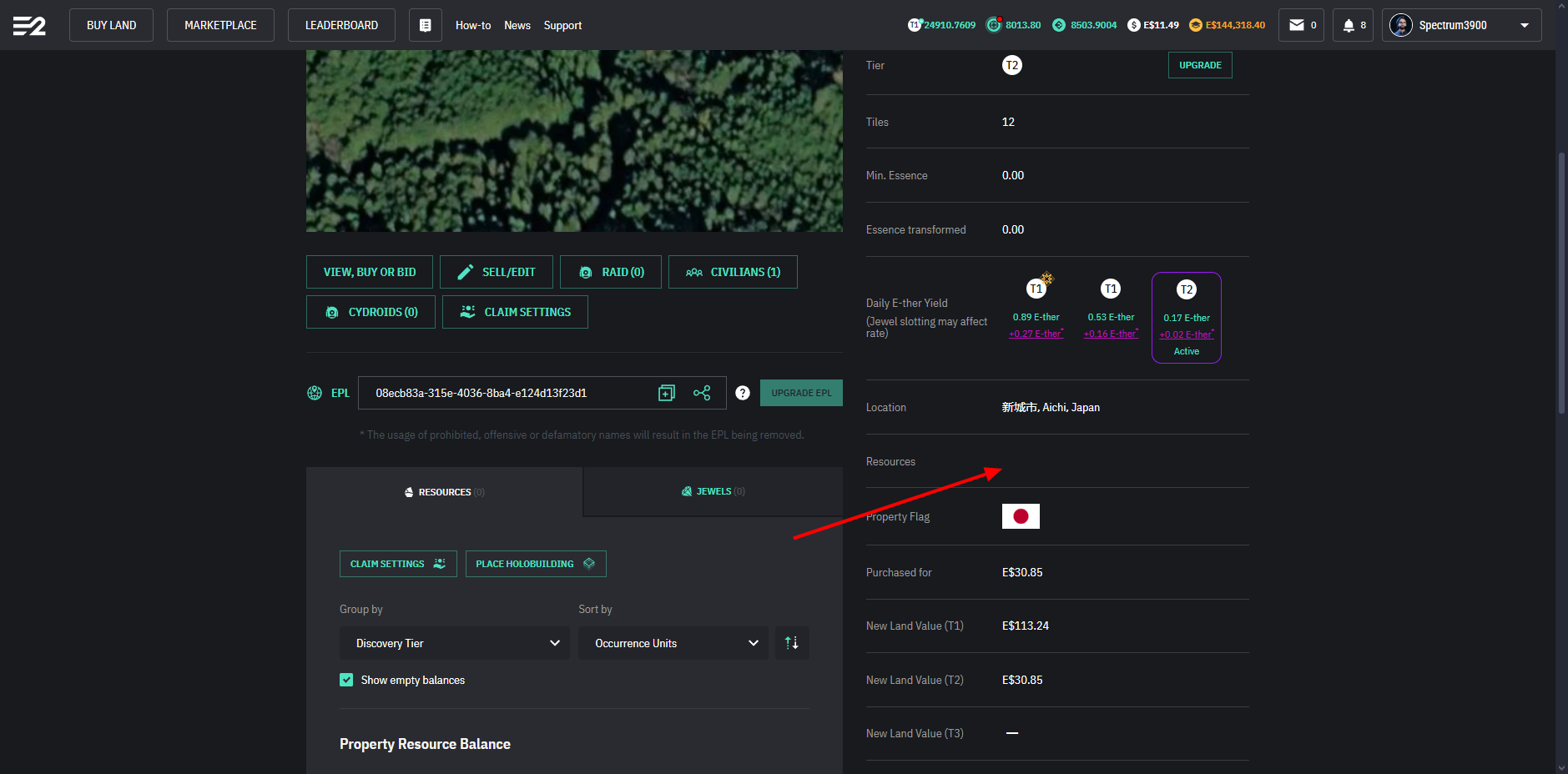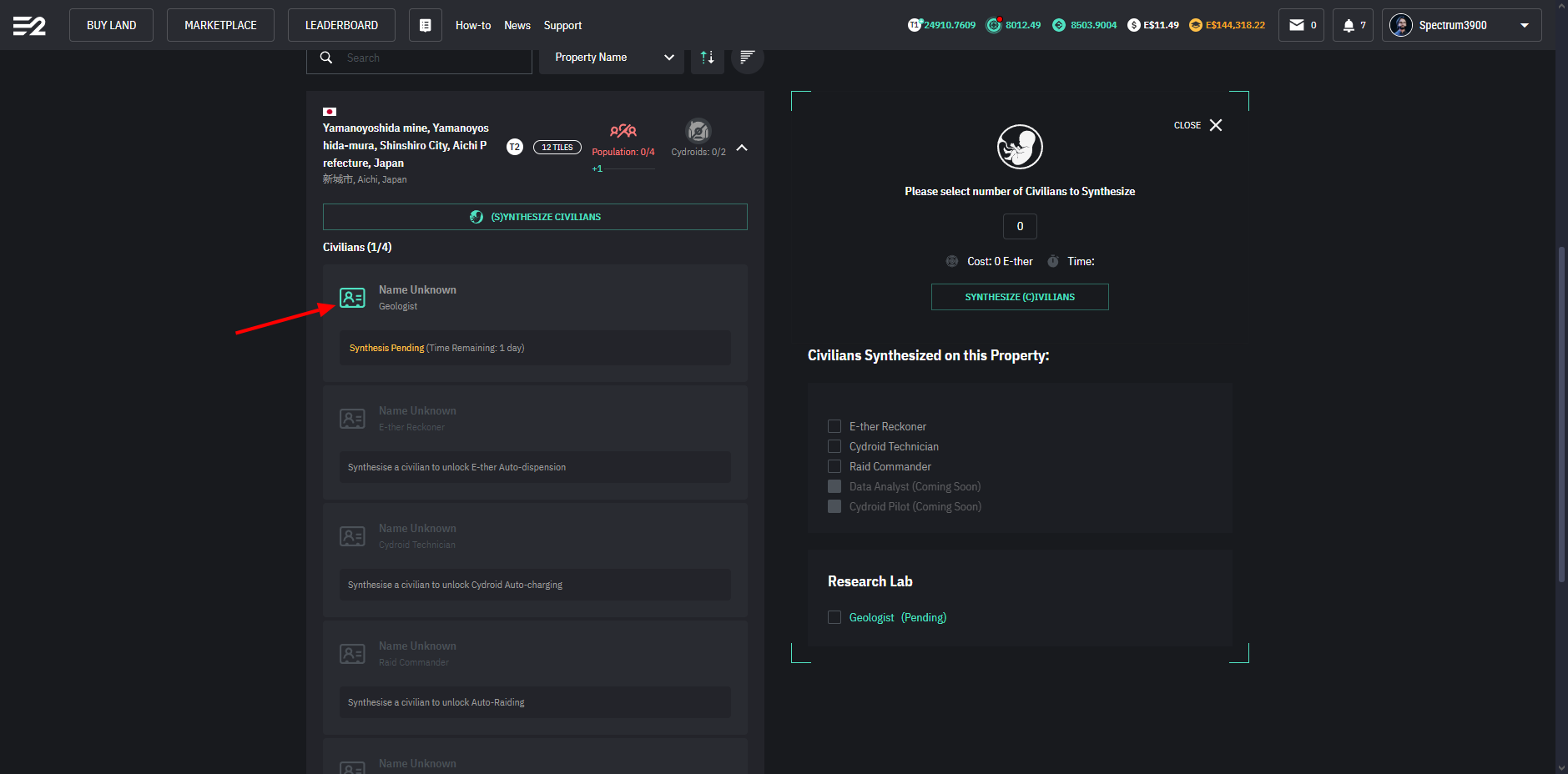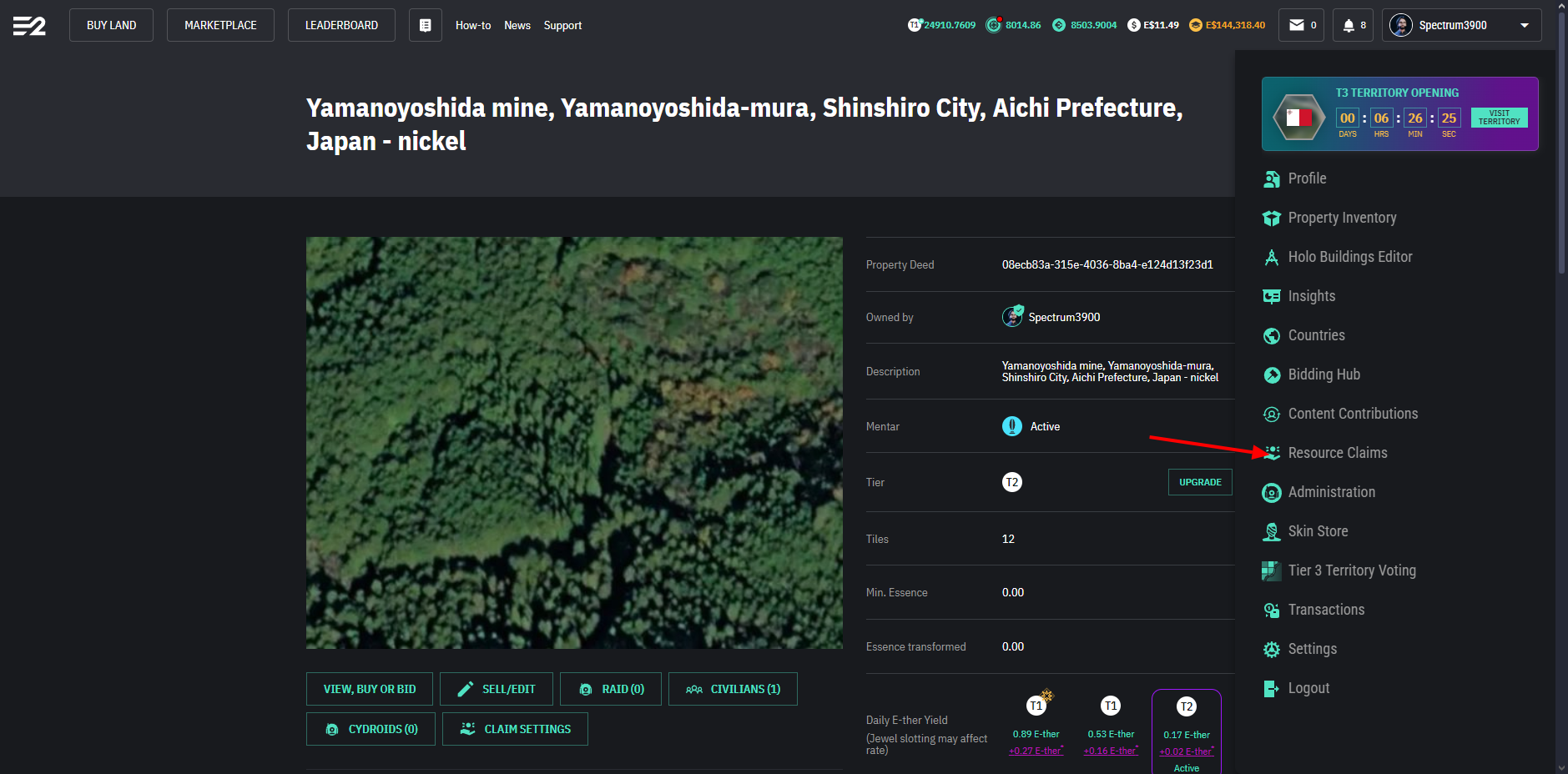 The location will be in the center of the screen, and we can buy 12 titles so that we will have at least 2 Cydroids. We have to wait at least 30 minutes for the property to finish resolving any resources. But in most cases, the land will not have the resource pre-filled. No worry, we will make a claim a bit later.