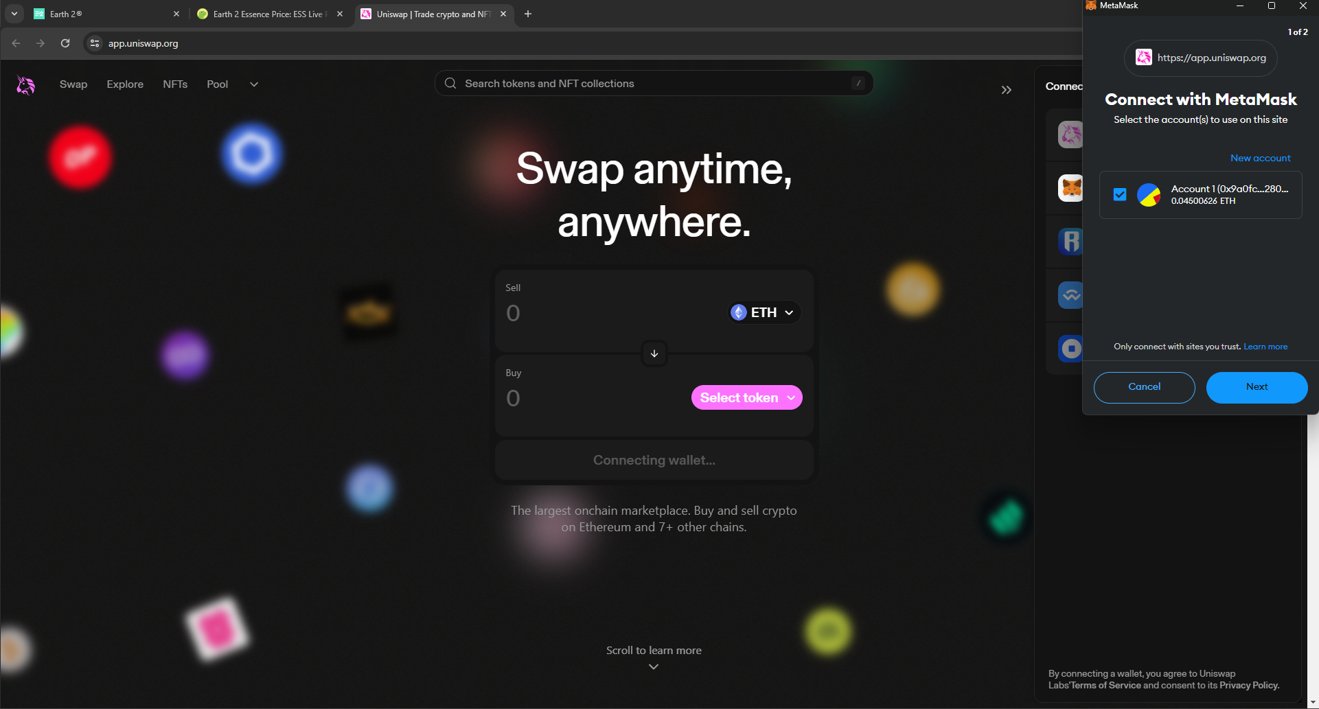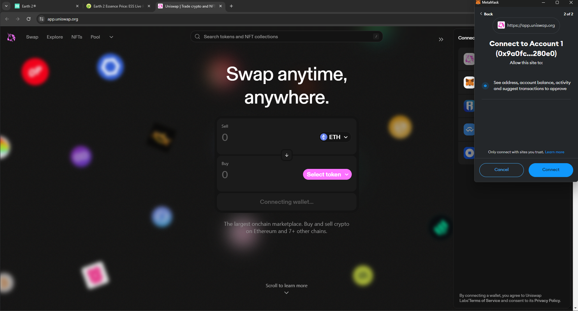 We are going to swap ETH for ESS with a 0.5% price slippage. Connect to Uniswap app first.
