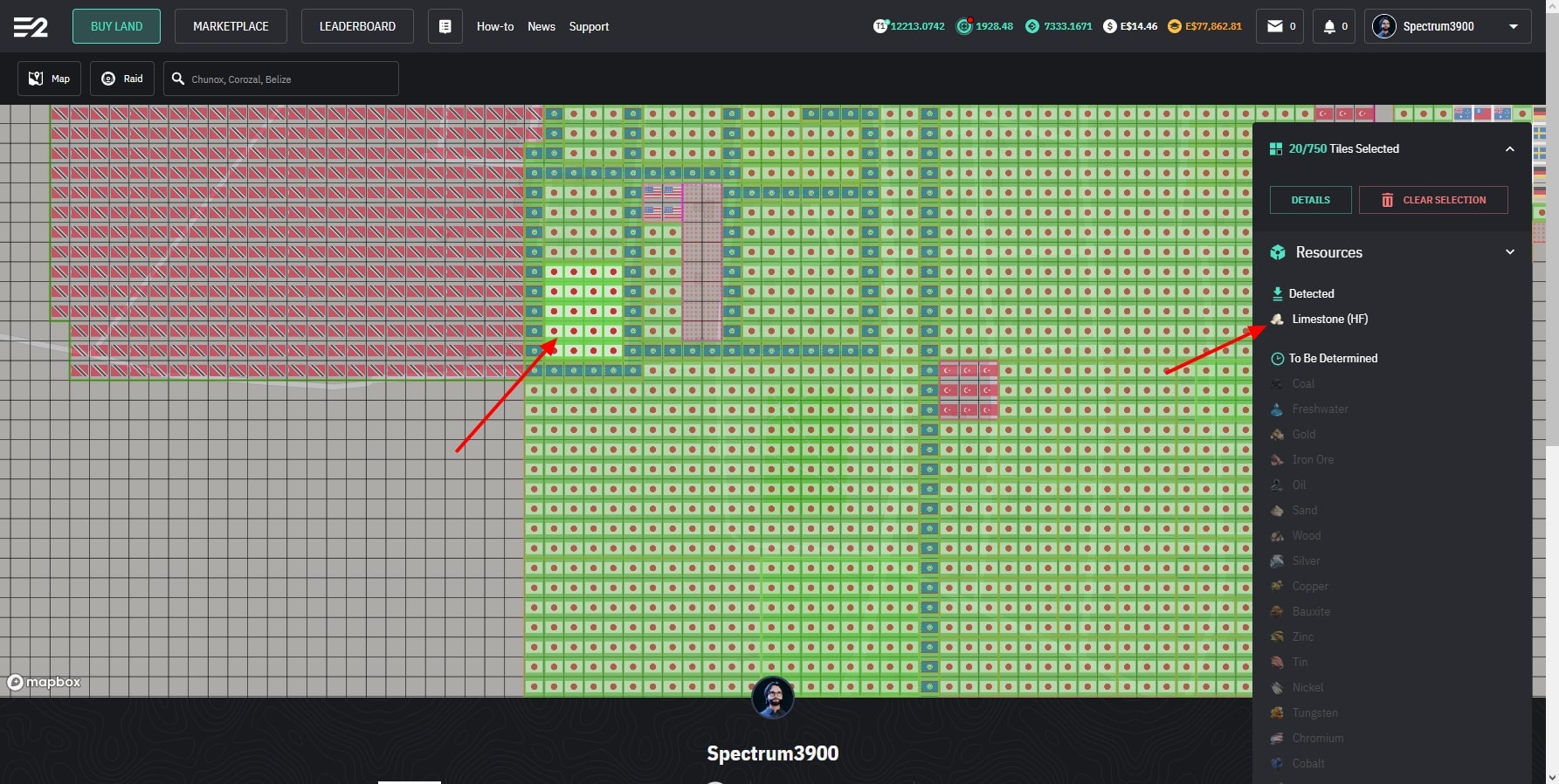 Here we can see land we own highlighted in green versus land we do not own and also empty tiles. You can change each property's flag