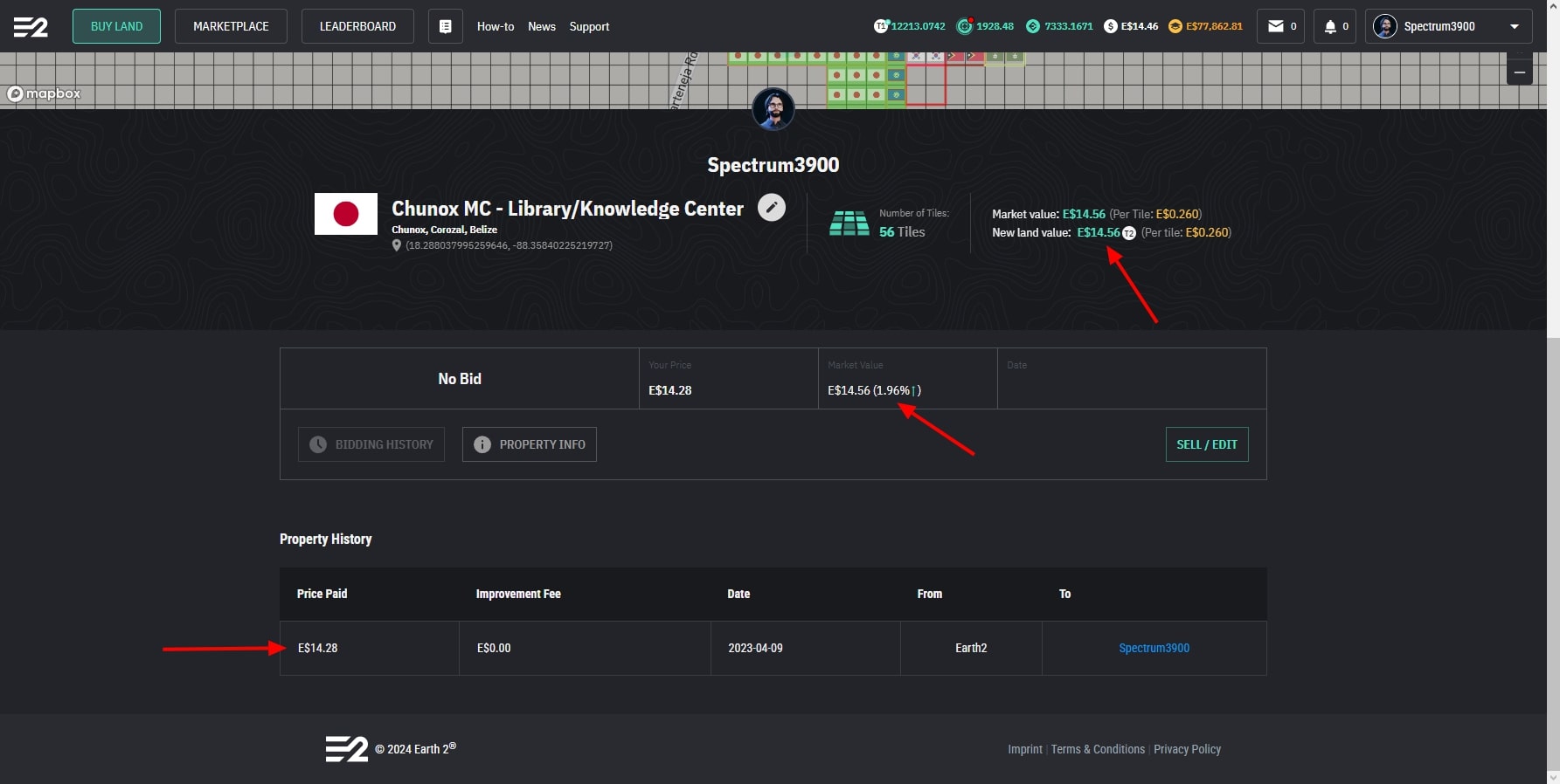 You may also see the history of a land. Like how much it is worth today and how much it was bought for. All good indicators to understand the dynamic of a country tile price. We can see this T2 land plot value and percentage increase from the purchase.