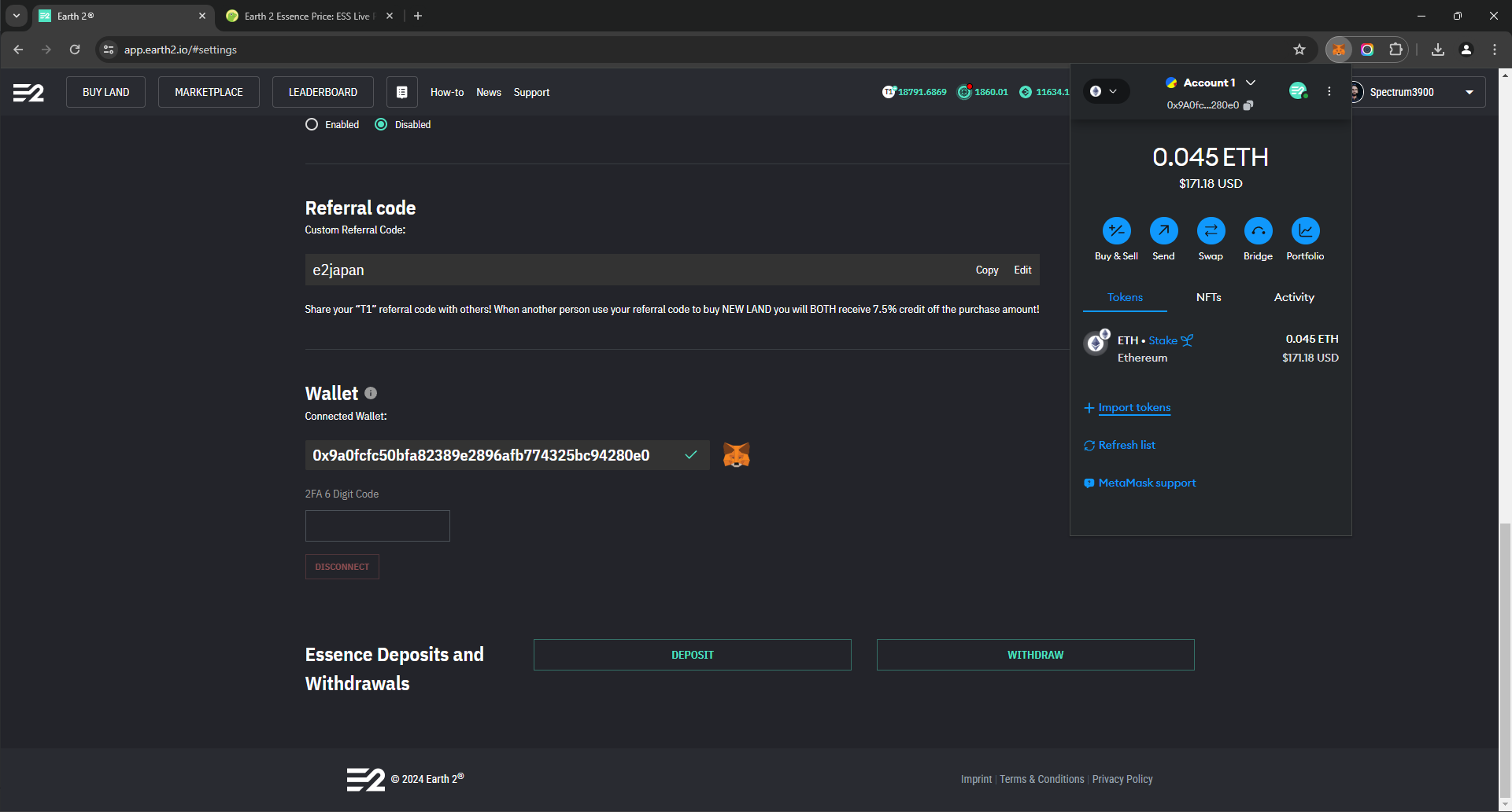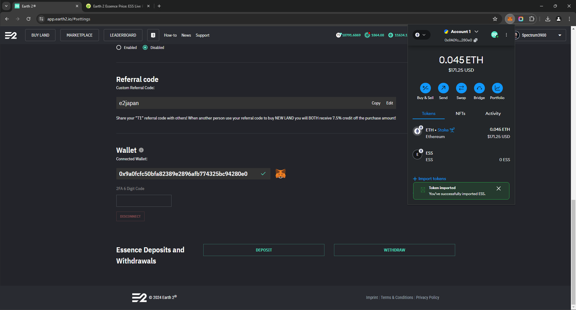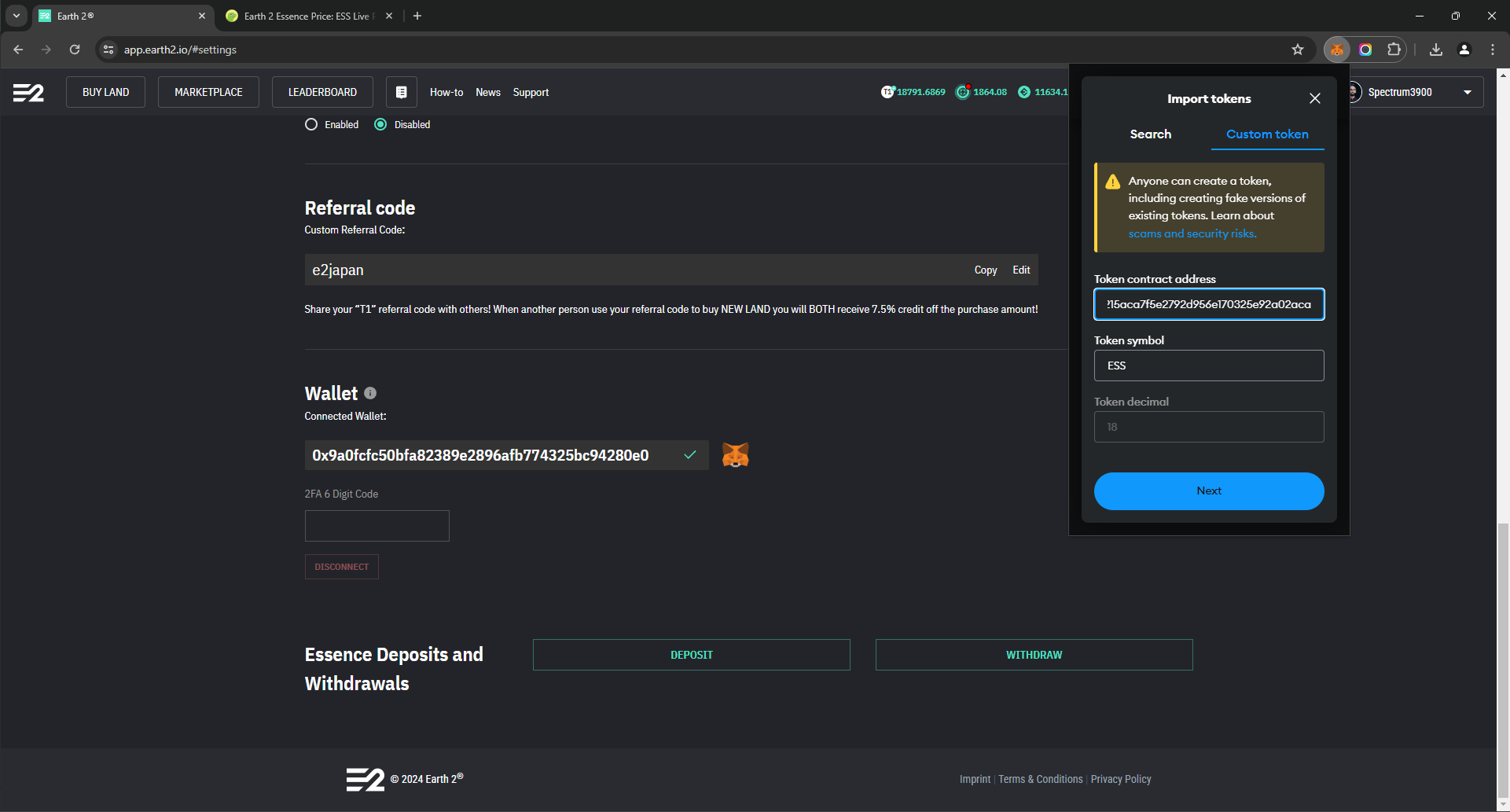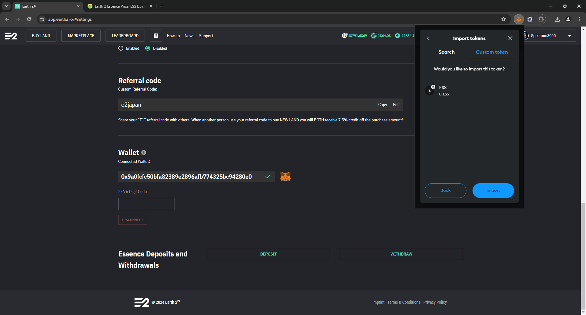 Now that we have our Metamask setup we need to import the Essence Token. We can copy the token contract from CoinGecko. https://www.coingecko.com/en/coins/earth-2-essence - which should look like that - "0x2c0687215aca7f5e2792d956e170325e92a02aca"